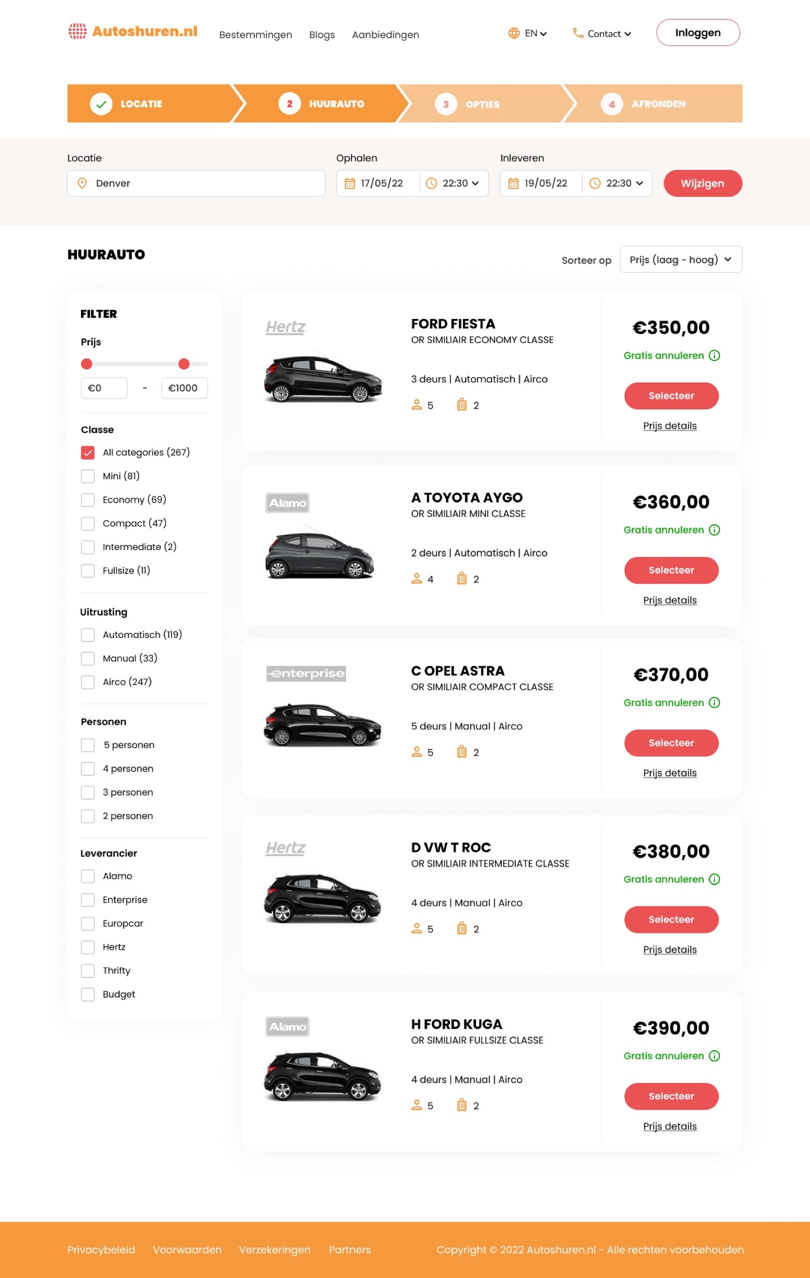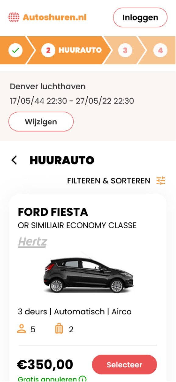 From the booking widget you enter the funnel. This page gives an overview of the available cars. The extensive filter options will help the user to find the right car quickly.